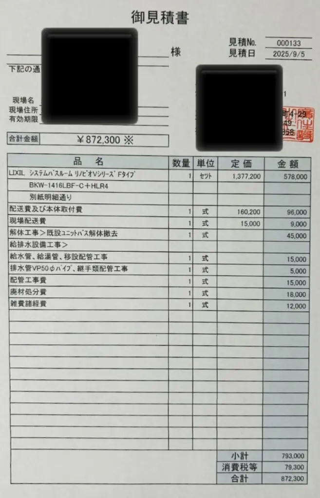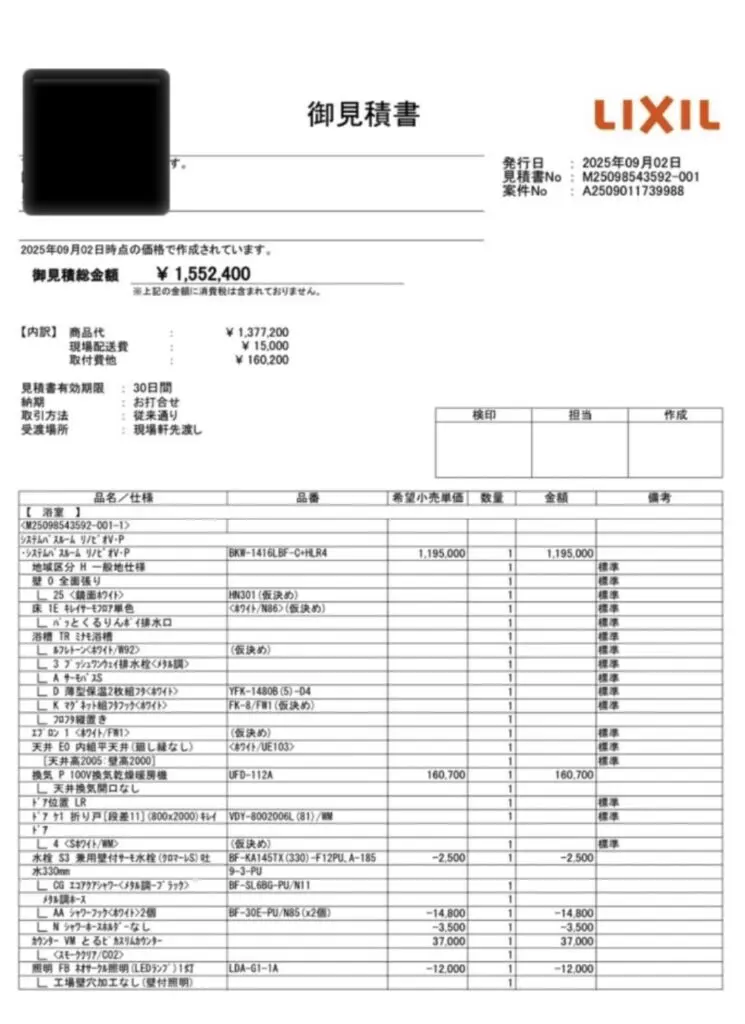 ユニットバスの見積りをLIXILから取り寄せた。
